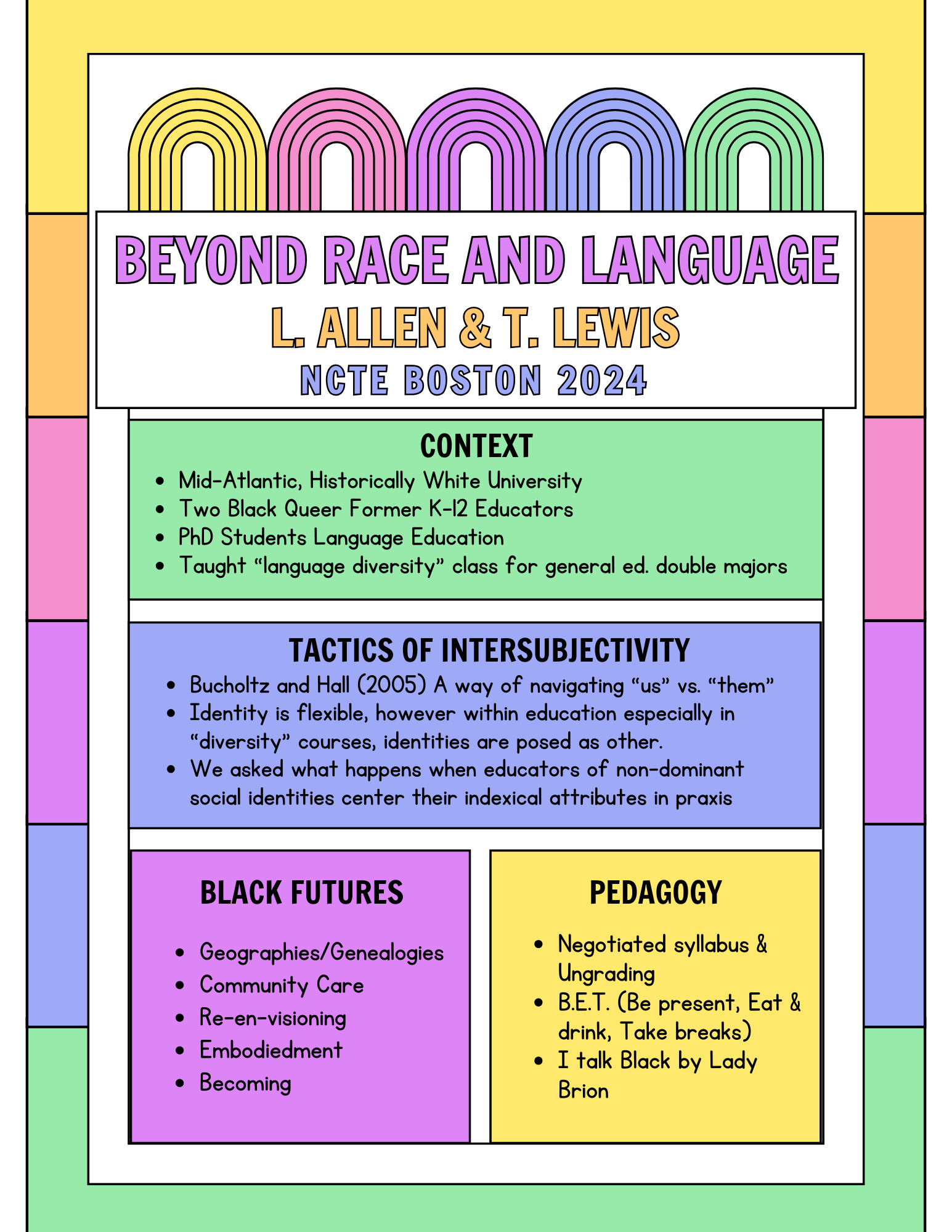 Me and fellow Black Language dreamer-scholar Lindsey Allen (she/they) presented as part of the Genders and Sexualities Equality Assembly (GSEA) roundtable session at this year’s National Council of Teachers of English (NCTE) Annual Convention on being Black queer teacher-educators bringing our full selves into the classroom.